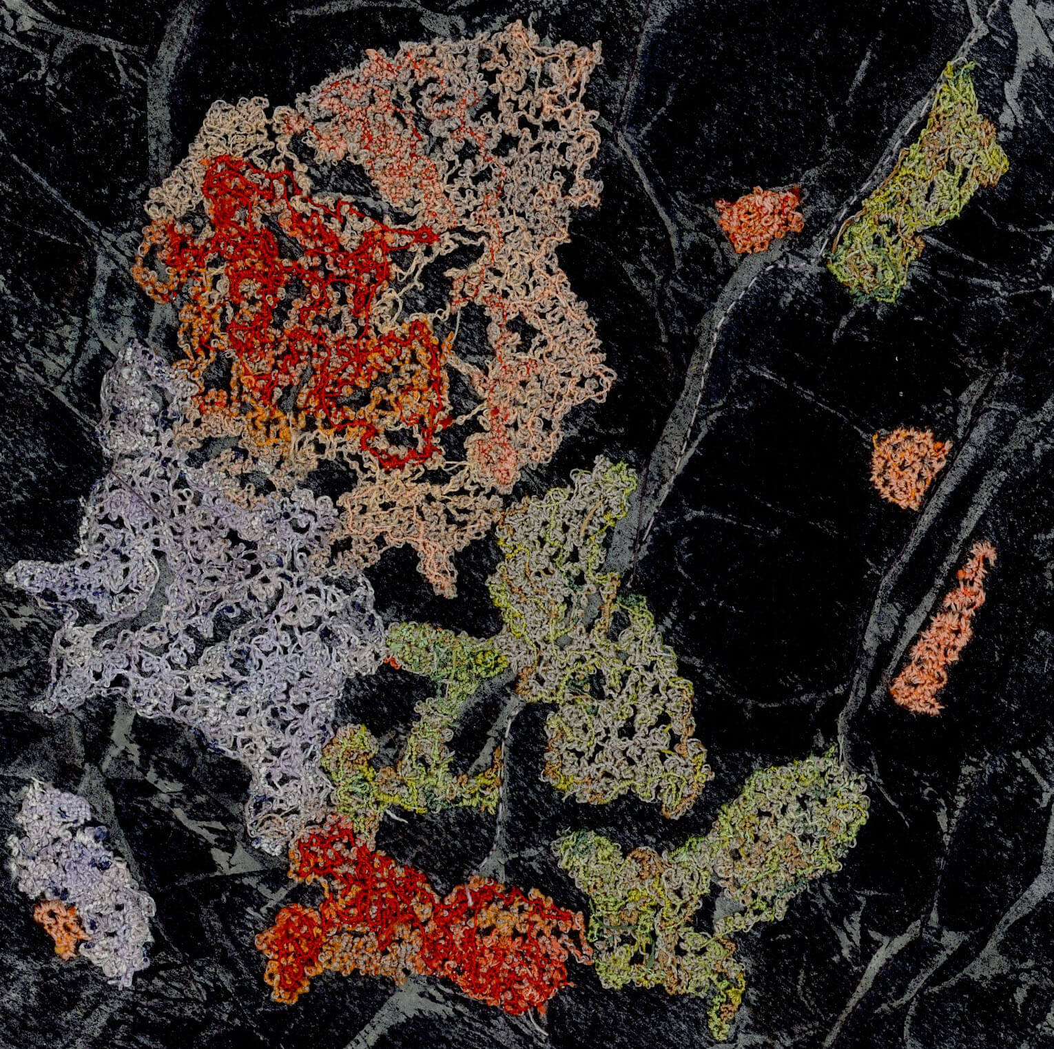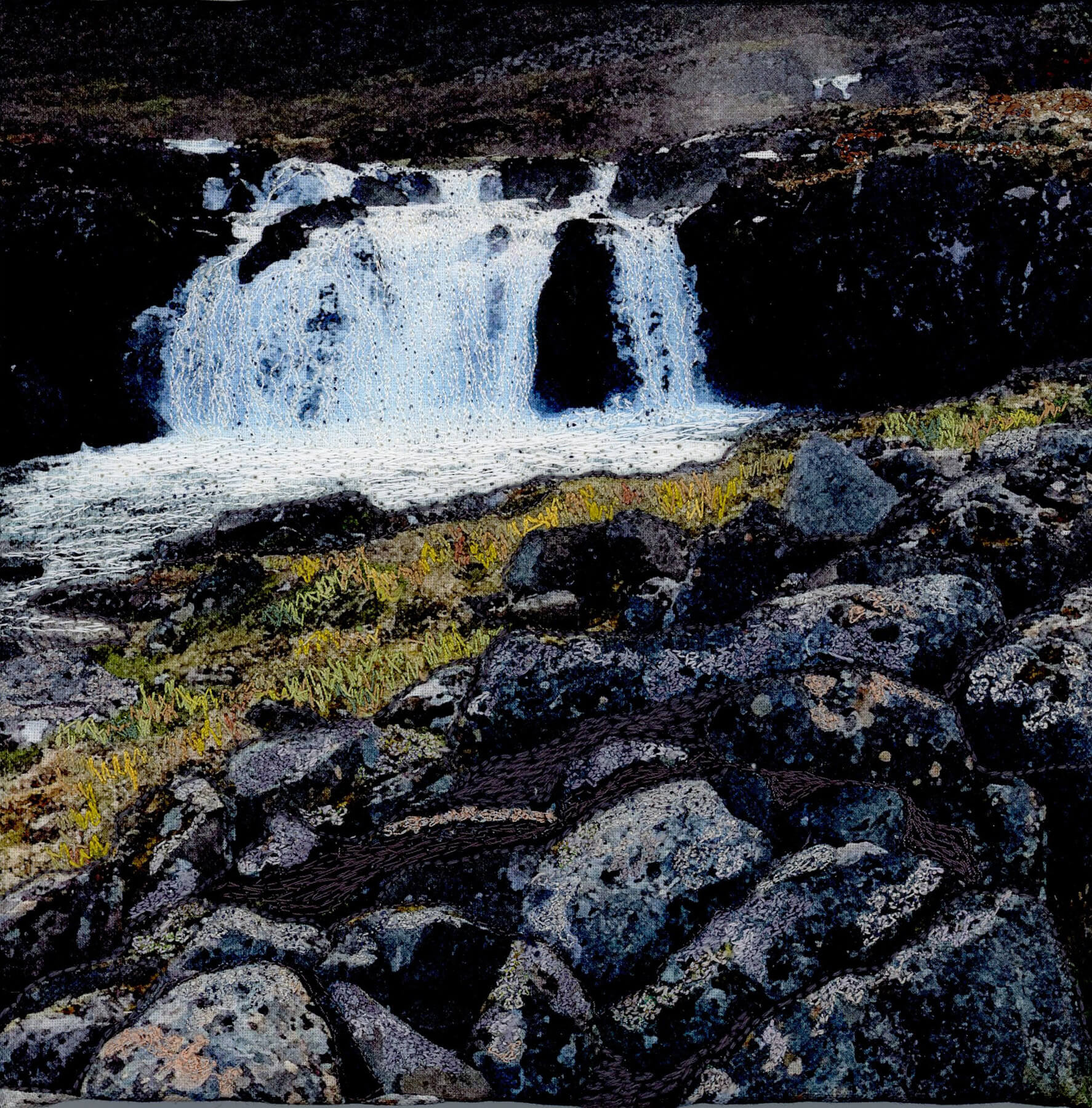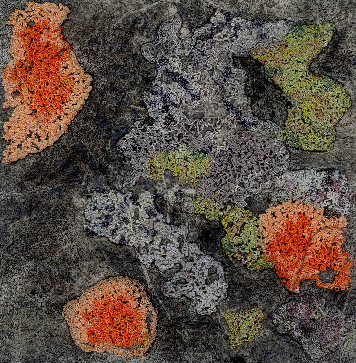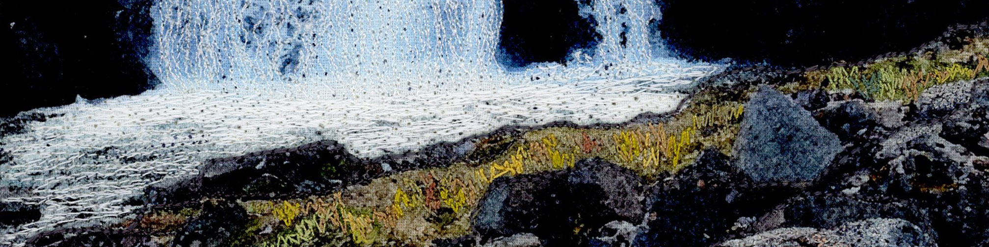 The often overlooked details in nature interest me: the veins on a leaf, the lichen on a rock, roots in the soil and the patterns of land and sea. These inspire my work which uses a variety of printing techniques and natural dyeing on fabric, enhanced by free machine embroidery. I aim to fascinate the eye with detail, pattern and colour.
